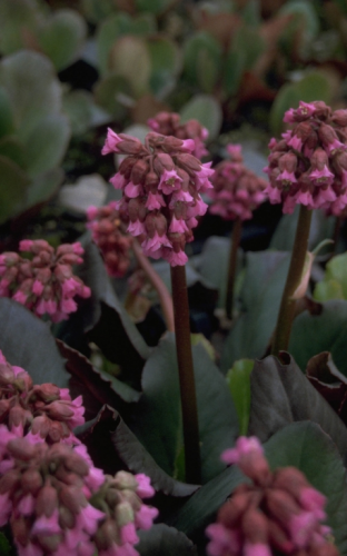 Bergenia are also known as elephants' ears: big, broad, leathery leaves turn shades of red and purple in autumn and stay evergreen all winter. Fat flower spires top the display in spring.